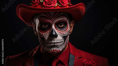 Man in spooky skeleton makeup on red background, Day of Dead.