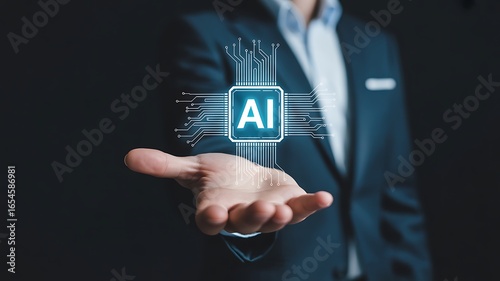 Man in suit holding A I chip graphic with circuit lines on open palm artificial intelligence technology