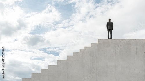 Man in suit standing atop concrete stairs against a cloudy sky, symbolizing achievement and future prospects.