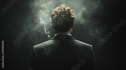 Man in suit stands in fog with back turned. Curly hair is slightly illuminated