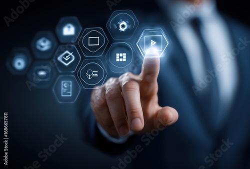 Man in suit touching futuristic digital interface with glowing hexagonal icons, representing connection and advanced technology in a modern, dark ambiance