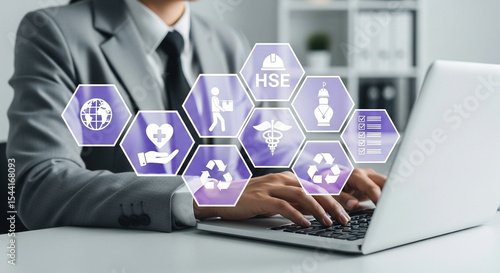 Man in suit typing on laptop with overlaid health safety environment and sustainability icons on screen
