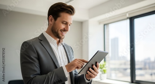 Man in suit using tablet standing by the window smiling indoors