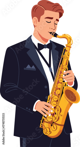 Man in tuxedo playing saxophone with eyes closed in illustration