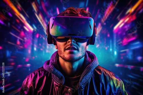 Man in virtual reality glasses, background bright cybpunk universe with neon