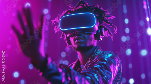 Man in VR headset and glittery jacket reaches out in a neon purple light.