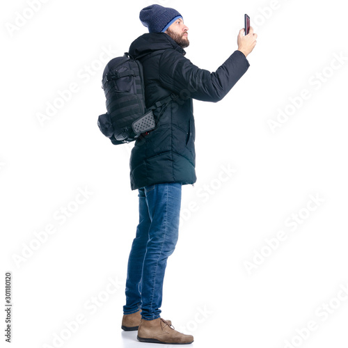 Man in winter jacket and warm hat, with backpack, smartphone standing