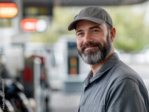 Man in working clothes, driver, loader on blurred background of cars on the street, photo. Photo, advertising, trucking, marketing, forwarding, shipping, transportation, transport, cargo, transportati