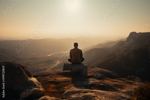 Man in yoga zen pose meditating on a mountain at sunrise or sunset. Balance and stability, meditation relaxation and peace. Natural therapy contemplation therapy. Ai generated