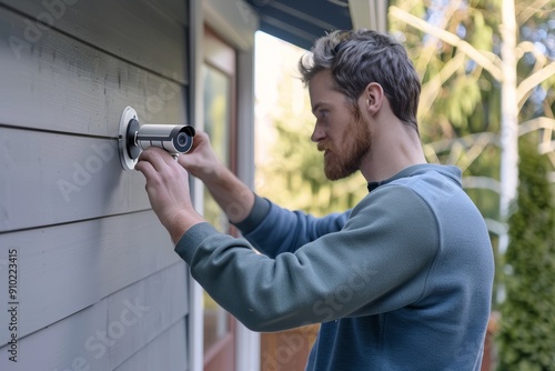 Man Installing Security Camera on House Exterior - Home Safety and Technology Concept