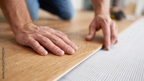 Man installing wooden flooring, focusing on craftsmanship and precision