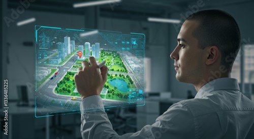 Man Interacting with Futuristic Smart City Holographic Interface Technology