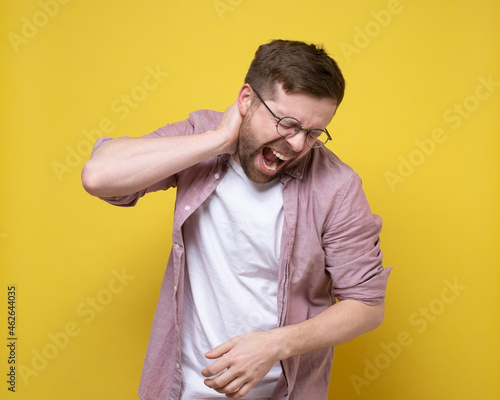 Man is experiencing severe pain in the neck area, he holds hand to the inflamed area and screams with eyes closed.