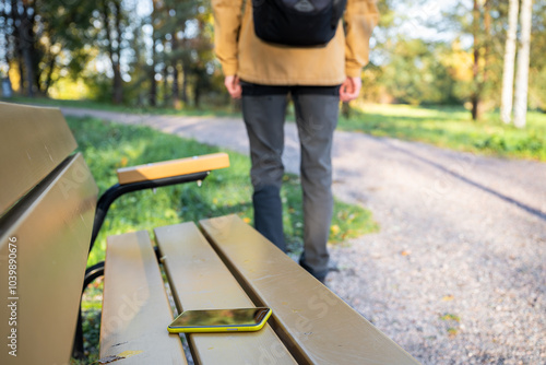 man is leaving from a bench where he lost his smartphone. Forgotten smartphone on a park bench.