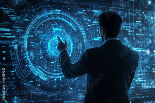 man is touching a blue circle on a computer screen. The circle is surrounded by a blue and orange border. The man is wearing a suit and tie