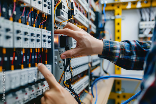 Man is working on a circuit board with a small screen. He is touching the screen and he is focused on the task at hand