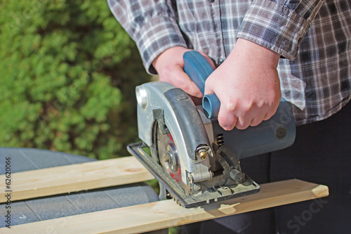 Man is working with electric circular saw