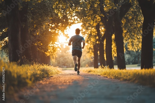Man jogging along tree-lined path at sunrise surrounded by nature