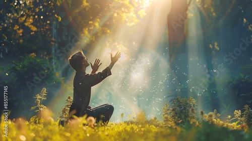 Man kneeling in a beautiful garden with a beam of light over his head, symbolizing divine presence. Perfect for themes of faith, spirituality, and devotion.