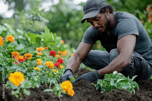 Man kneeling in garden planting colorful flowers in bright sunshine