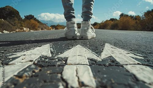 man legs in sneakers standing on road with three direction arrow choices, left, right or move forward