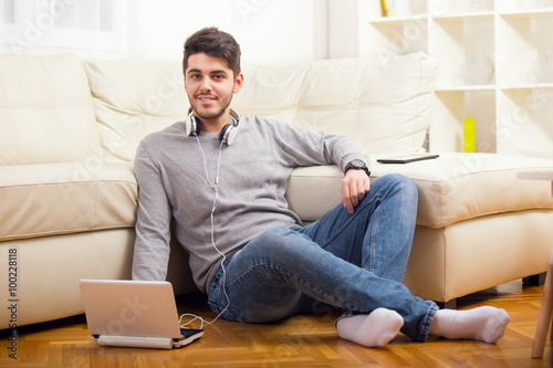 Man listening to music with earphones on laptop computer, sitting on the floor near the sofa