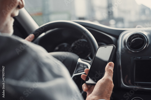 Man looking at mobile phone while driving a car. Old pensioner person distracting texting and chatting..