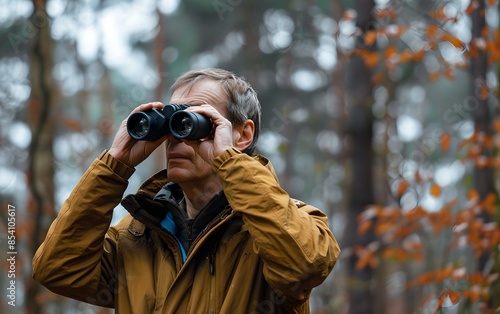 Man looking through binoculars in the forest. Birdwatching, zoology, ecology. Ornithology, research in nature, observation of birds. Adventure and exploration concept