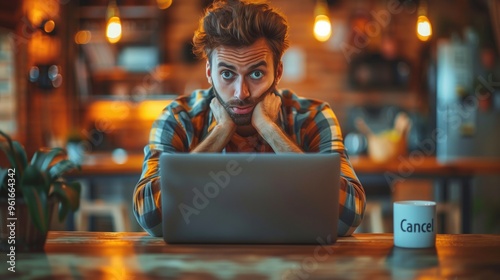 Man looking with panic on monitor screen. trying to cancel an unwanted subscription on a website, looking annoyed
