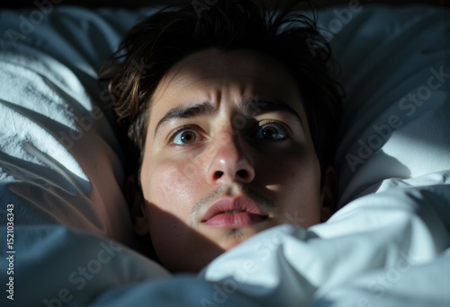 Man lying in bed with a worried or anxious expression illuminated by a soft light