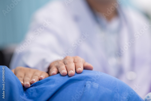 Man male obstetrician doctor in white uniform coat gown with stethoscope to check womb stomach in delivery room. gynecologist in gown coat sit and hand touch check womb pregnant abdomen mother.