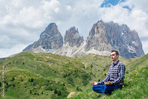 Man meditates in nature on a lush green hillside with majestic Dolomite Mountains in the background