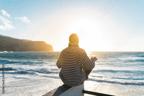 Man meditating at the coast at sunset, Sao Miguel Island, Azores, Portugal