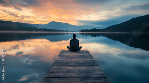 Man meditating on a dock overlooking a calm lake at sunrise. Peaceful scene.