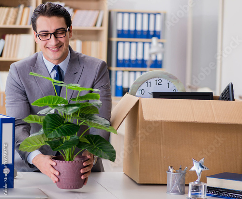 Man moving office with box and his belongings