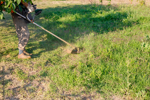 man mows grass with a petrol mower on a green field in the garden on a sunny summer day. Lawn care