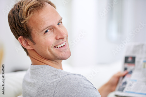 Man, newspaper and article in home portrait, calm and comfortable on weekend in living room. Male person, reading and print in apartment, information and rest on couch in pyjamas for story update