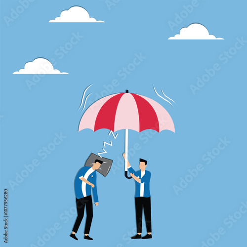 Man offering support and protection to a tired businessman
