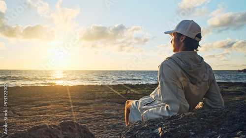 Man on a beach is looking distance during beautiful summer sunset. Human looks to the sun over horizon in the morning while sunrise. Happy person contemplates the beauty of nature. Freedom concept.