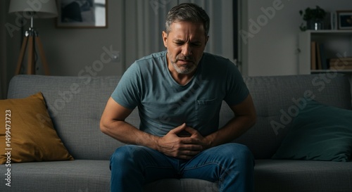 Man on couch clutches painful stomach