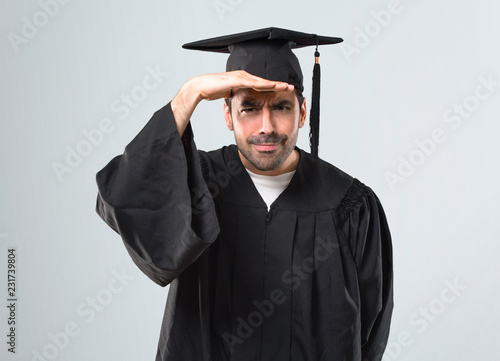 Man on his graduation day University looking far away with hand to look something on grey background