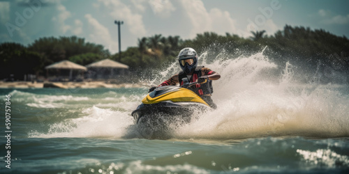 Man on water scooter, water sports, vacation, summer and leisure, one the sea, beach, generated ai