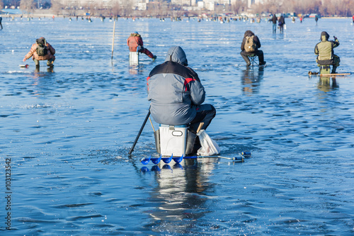 man on winter fishing, people on the ice of the frozen lake, fis