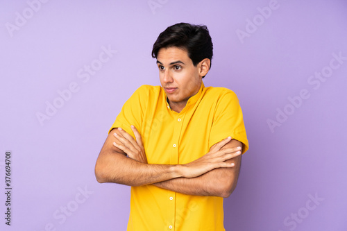 Man over isolated purple background making doubts gesture while lifting the shoulders