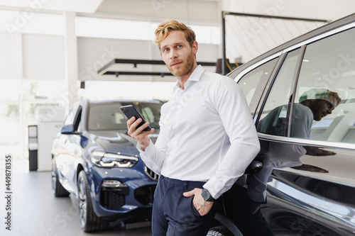Man pensive customer male buyer client wear white shirt talk mobile cell phone leaning on car choose auto want buy new automobile in showroom vehicle dealership store motor show indoor Sales concept.