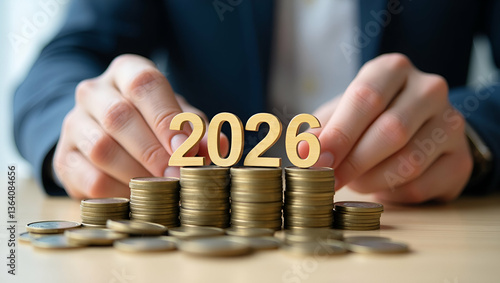 Man Places Gold Wooden '2026' on Coin Stack: Symbolizing Tax Payment, Investment Banking, and Financial Planning for the New Year - Stock Photo Concept