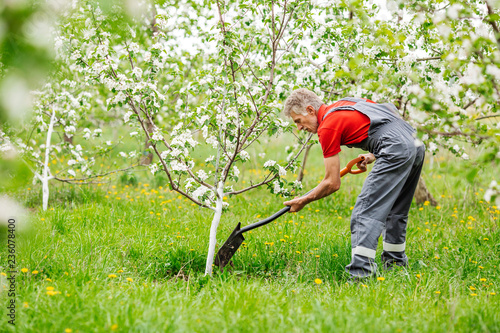 man planting tree and digging hole with shovel in gardenpeople and farm concept