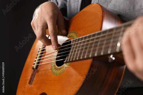 Man playing guitar on black background, closeup