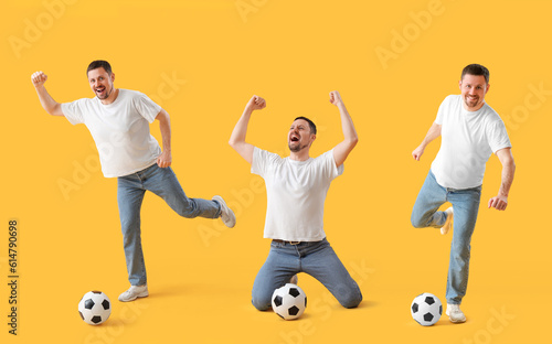 Man playing with soccer ball on yellow background