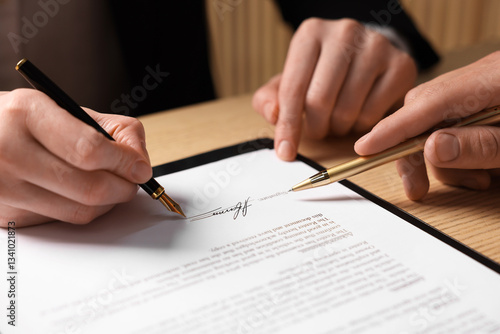 Man pointing at document and woman putting signature at table, closeup